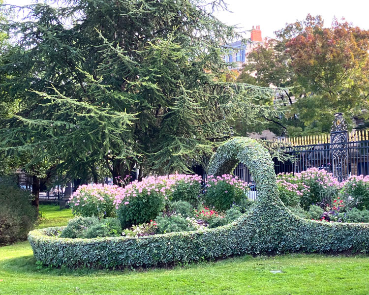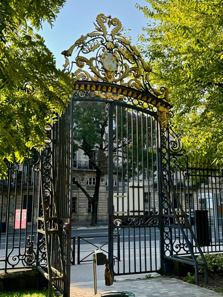 After admiring the allegorical bronze sculptures surrounding the base, we made our way through a blue iron gate into the Jardin Public, a lovely oasis of planned nature including an island set aside as a children’s playground; expansive lawns; a monumental “folly”; and an Orangerie where we paused for a cup of espresso before exiting to the streets to circumvent Bordeaux’s Golden Triangle.