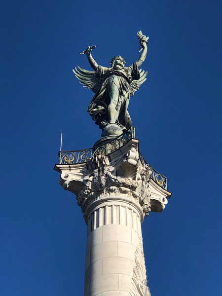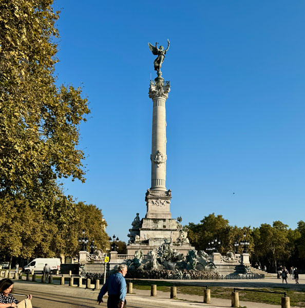 Leaving our hotel, we made our way to the Monument aux Girondins, commemorating the martyrdom of the Girondists, a political faction executed during the French Revolution’s Reign of Terror. Atop the tall central column is a statue representing Liberty breaking her chains, symbolic of the Girondists’ ideals. She and the 54-meters tall column she crowns became a landmark for us as it can be seen from numerous vantage points throughout the old town.