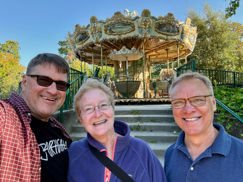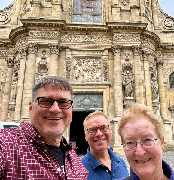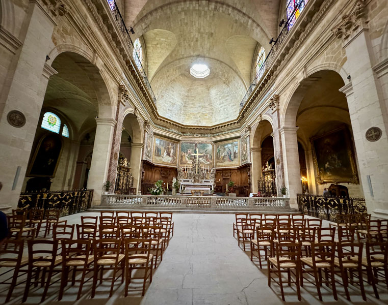 Our group separated into shoppers and non-shoppers as we walked down another stretch of rue Sainte-Catherine, which is billed as the longest shopping street in Europe BTW. Rob, Peg and I were in the lead and within sight of Dan and Mary. The Rosenbergers and Fongs fell increasingly behind as shops beckoned and they responded. Pausing to allow the stragglers to catch up, Dan directed the three of us to an arcade lined with small shops that lead to a hidden courtyard with an equally-hidden church.