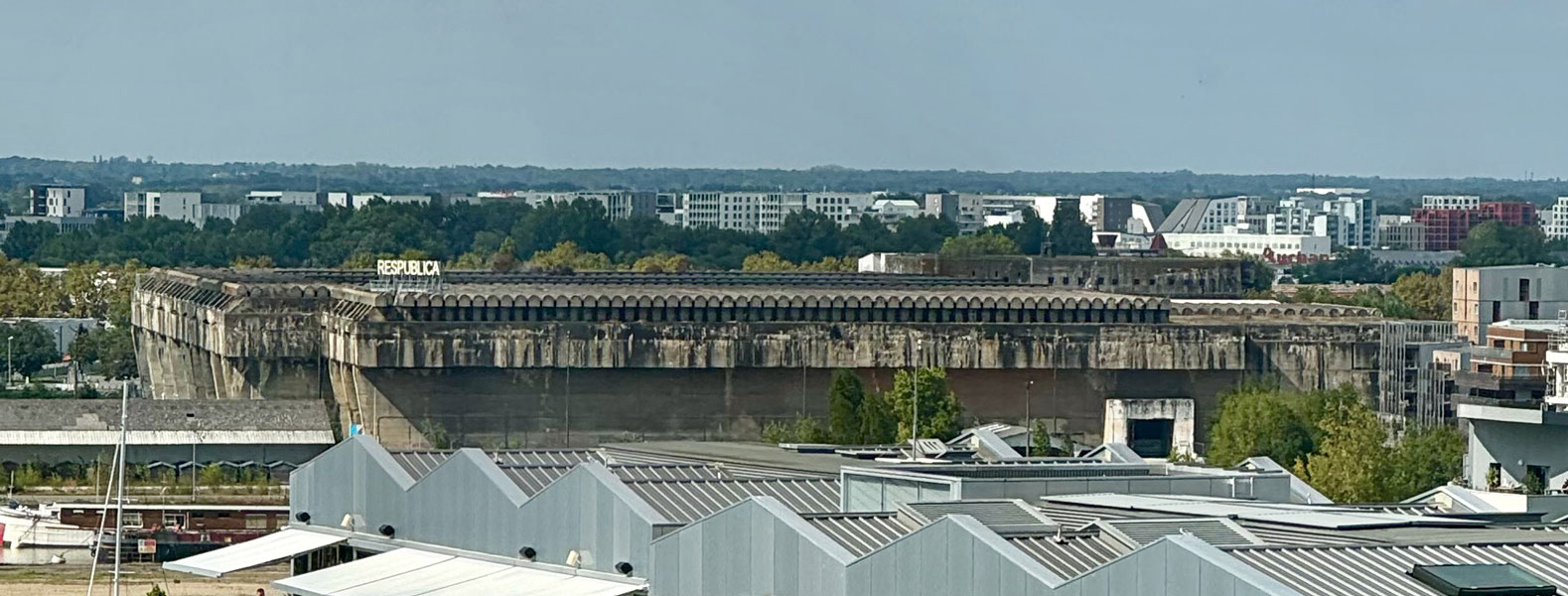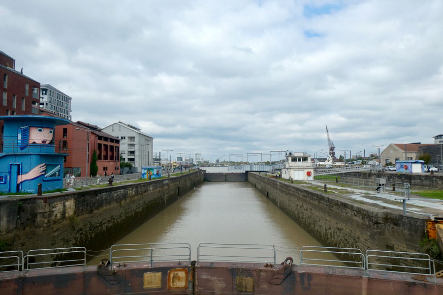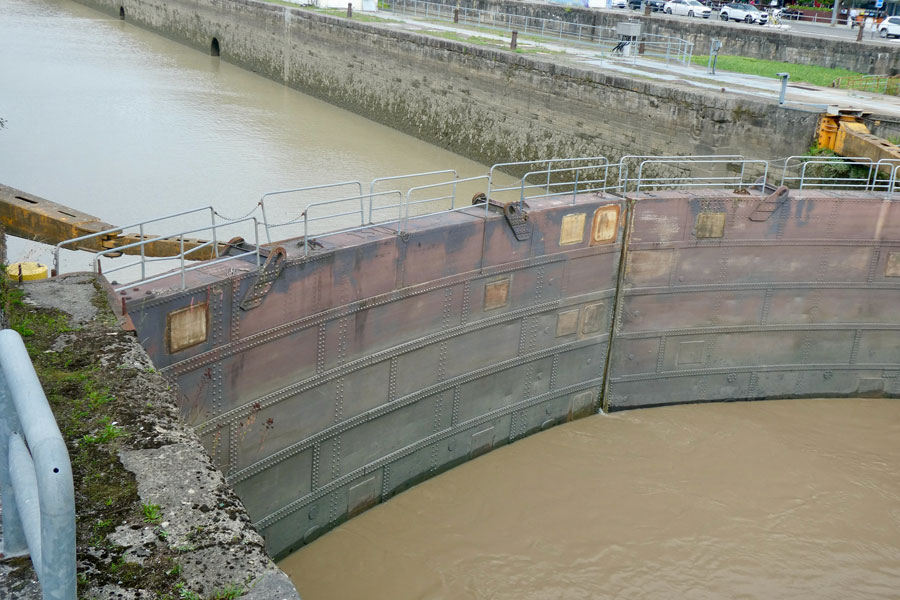Then, after being dropped off at the tram stop, on the short walk to the market, we passed two notorious remnants of WWII and the Nazi occupation of Bordeaux: the German-engineered (and still operational) canal lock leading to an inner harbor; and, just beyond to the right, the hulking mass of the former Nazi submarine base, Base Sous-Marine. With 7-meters thick concrete walls and roof, it survived constant Allied bombing and remains, to this day, more or less indestructible. As of 2010, about one-third of the building has been opened to the public, repurposed as a cultural center for more creative, less destructive ends.