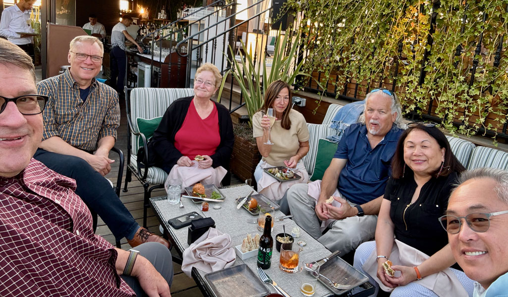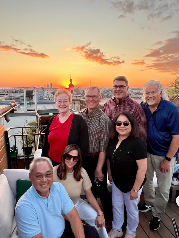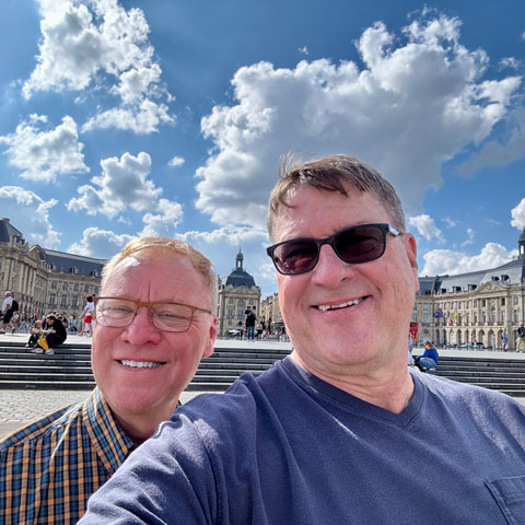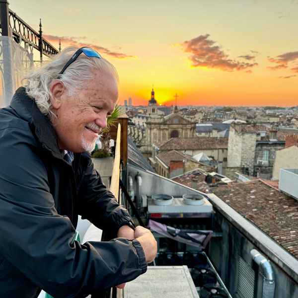 Tour completed, we found a little cafe to enjoy a beer and plan the evening. Our goal was to toast the sunset from the roof of the Intercontinental Bordeaux before packing up for tomorrow’s change of venue. As it turned out, the WVIZ-Five were already atop the hotel, cocktails in hand, awaiting the sun’s demise. We joined them.