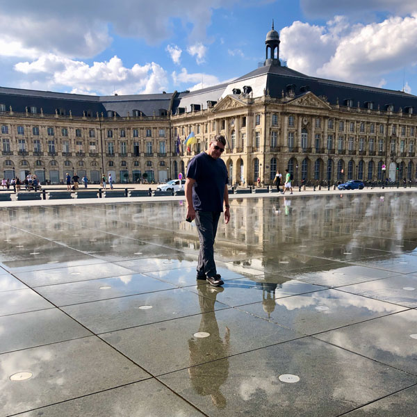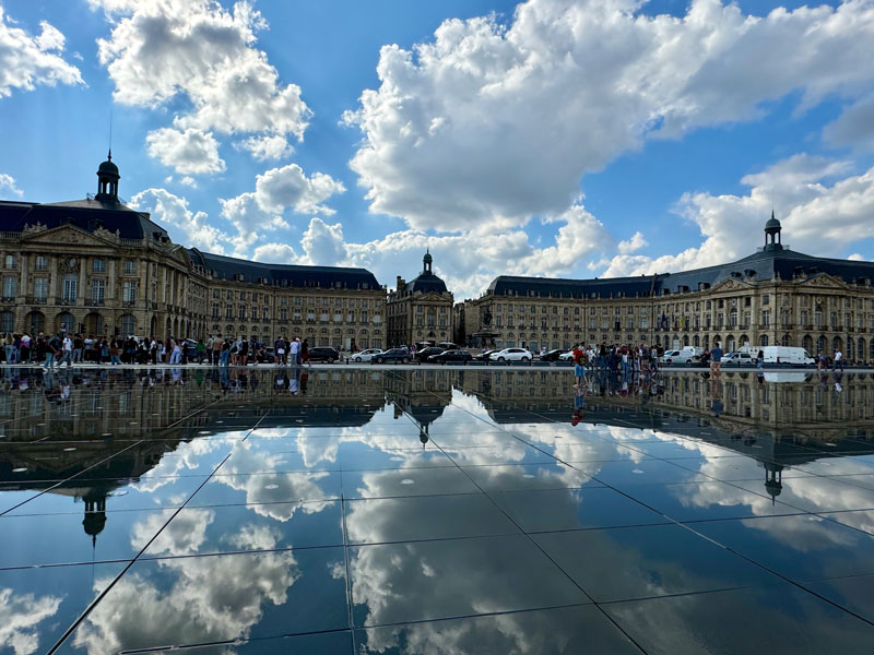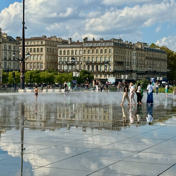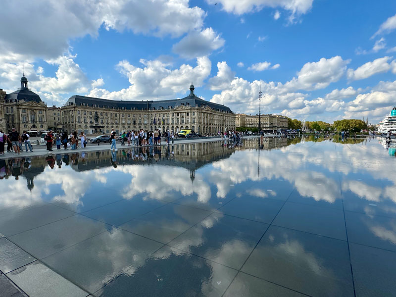 Between the Place and the river is the Miroir d’Eau (Water Mirror). It is the world’s largest reflecting pool and one of the most photographed spots in Bordeaux. And it’s not just a static space. Every fifteen minutes, a fine layer of steam rises up, rolls across the dry granite slabs, and then dissipates, exposing a pool now filled with 2 cm. of reflecting water.